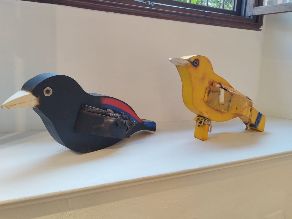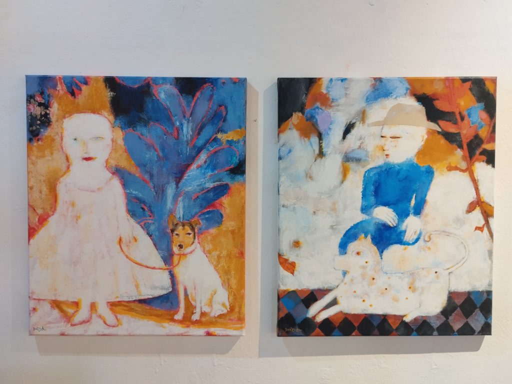 His style is simple, foregrounded and without perspective, sometimes with a sense of being unfinished, but with a richness and composition of colors that captures the observer’s eye. Influences from other artistic movements such as Eastern, Romanesque, Italian, Spanish, and other styles can be seen in his painting, but with his personal and unique style that makes him so recognizable. For this exhibition, he uses a mixed media on canvas, with touches of gold, thread, fabric and paper, perfectly integrated with the painting, creating scenes where the figures coexist with the natural background. His work also has an abstract component that encourages viewers to complete it or add details themselves.