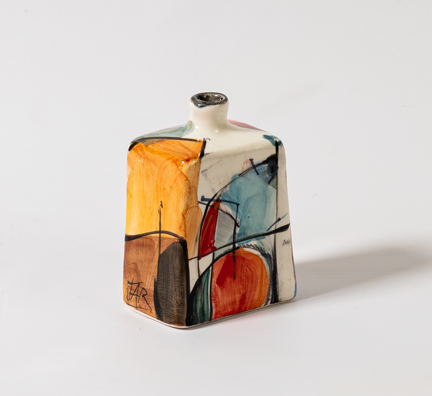 Small, low bottle with rectilinear shapes and a narrow mouth. The surface treatment is unique, done by hand with iron, manganese, cobalt oxides and ash glazes, combining wax reserve and sgraffito techniques. Dimensions: 10x6x14cm.