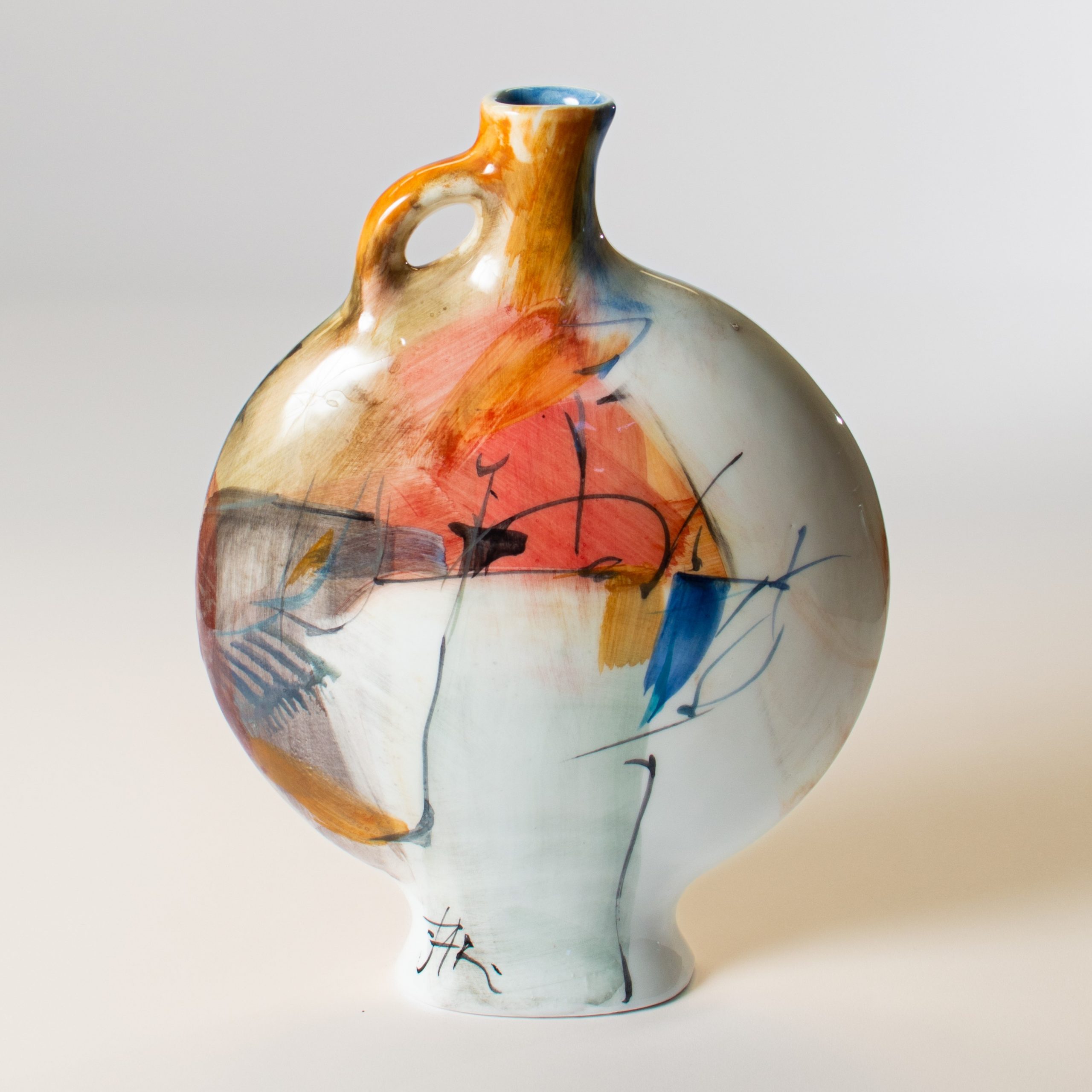 Lenticular vertical grande jarra (Large vertical lenticular jug) has a lenticular shape with one mouth and a handle, fired at 1050º C and decorated with ceramic pigments and glazed with transparent enamels at 980º C. Dimensions: 32 x 23,5 x 7 cm