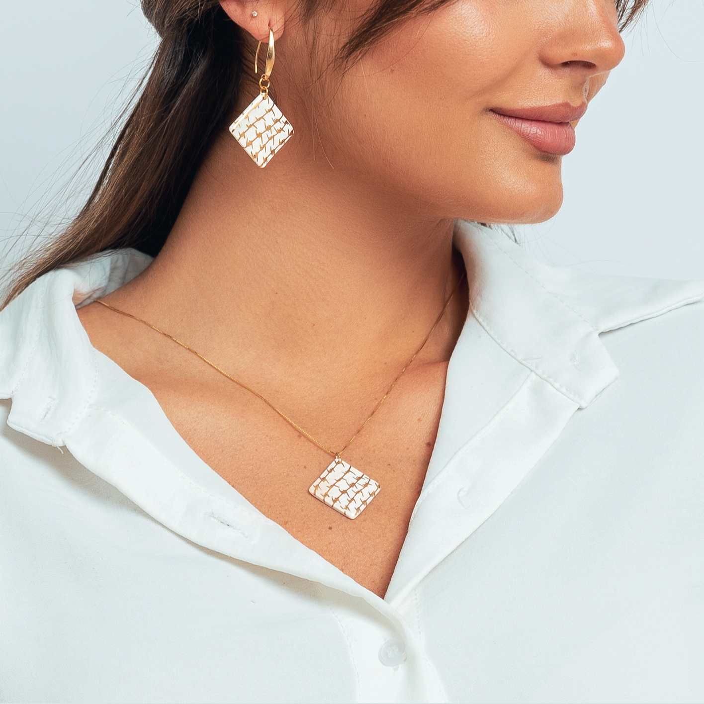 Conjunto Colgante y pendientes espino, rombo porcelana y oro