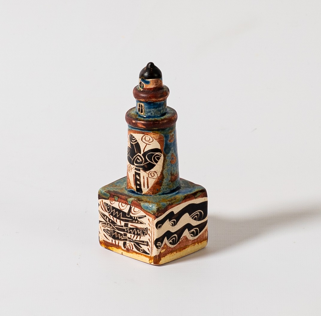 Mini farola vela Alfajar está decorada con imágenes relacionadas con la ciudad de Málaga como la biznaga, flor hecha con jazmines muy típica de nuestra ciudad o el espeto de sardinas. El tratamiento superficial es único en cada pieza, se realiza a mano con óxidos de hierro, manganeso, cobalto y vidriados de ceniza, combinando técnicas de reserva de cera y esgrafiado. Se hornea en monococción a 1250º C en atmósfera oxidante. Cada pieza es una obra única hecha a mano 100% en Málaga, España, incluye la firma manuscrita de su autor.  Farola Alfajar es un homenaje a uno de los símbolos más representativos de Málaga como es la Farola. Nuestra versión de la farola respeta su forma y proporciones. Se trata de un faro que desde su configuración original a finales del siglo XVIII, ha mostrado diferentes aspectos tanto en su forma como en su color. Su aspecto actual es una silueta blanca que preside el puerto en su flanco Este y es apreciada por todos los malagueños.