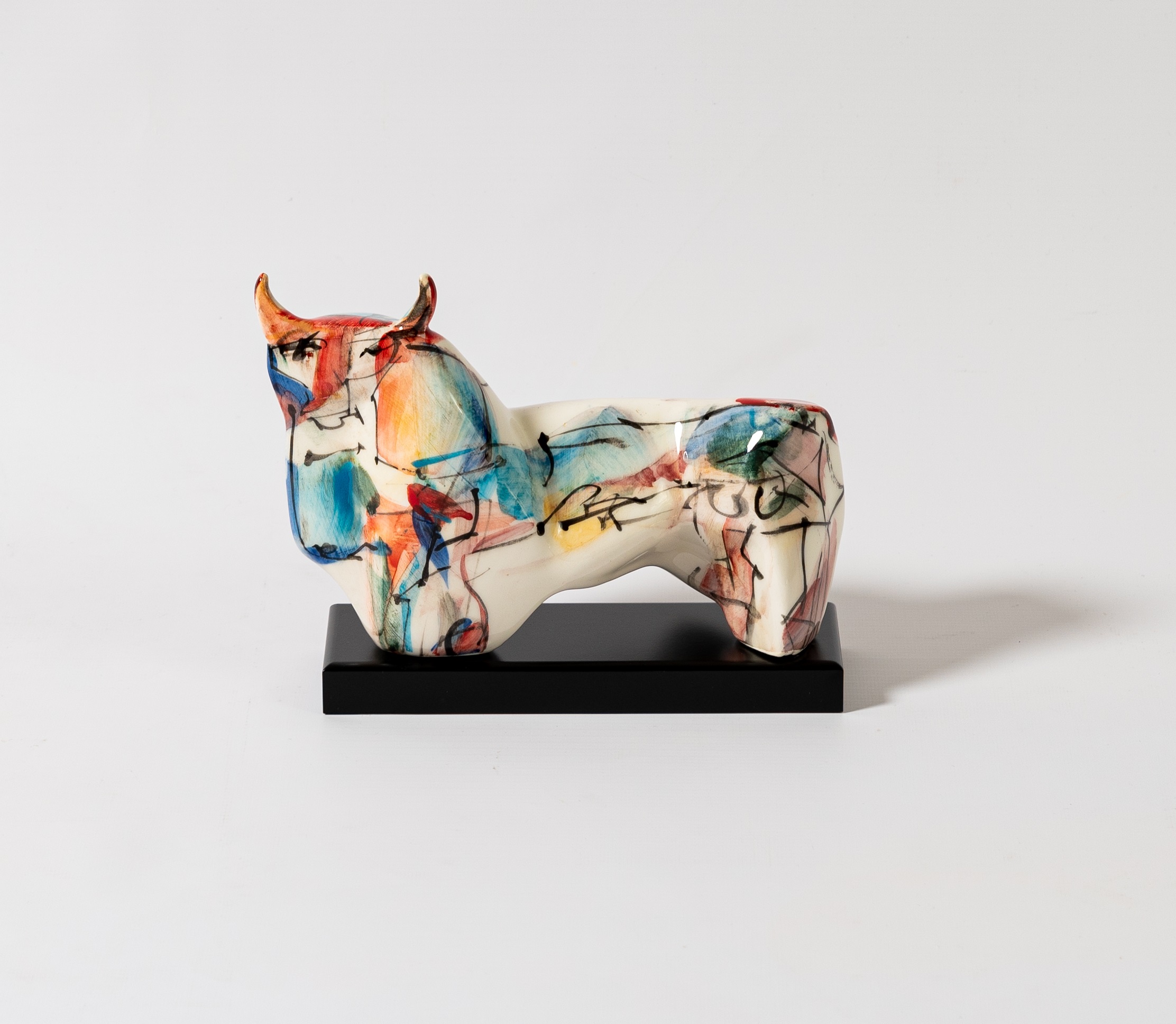 Toro pequeño color es una elegante pieza para el hogar dentro de la línea de trabajo a color que permite disponer de una amplia y vibrante gama cromática. Cada pieza recibe un tratamiento individualizado que la convierte en una obra singular e irrepetible, con la firma manuscrita de su autor. El toro representa a los dioses celestes en las religiones indomediterráneas. Es símbolo de potencia y fogosidad, además de fuerza creadora. Son múltiples las referencias al toro en las mitologías clásicas: Zeus adopta la forma de un toro de deslumbrante blancura para seducir y raptar a Europa; es también el feroz guardián del Laberinto de Creta. Estos atributos, que impregnan entre otros nuestra herencia cultural, inspiran nuestras diferentes versiones del toro Alfajar. La forma de toro en nuestra versión color es un pretexto para desplegar en su superficie diversas composiciones de carácter expresionista, elaboradas de forma individual con absoluta libertad compositiva y cromática. Sobre un cuerpo de mayólica bizcochada aplicamos pigmentos cerámicos en una gama cromática prácticamente ilimitada, bajo un vidriado transparente y brillante horneado a 980º C.